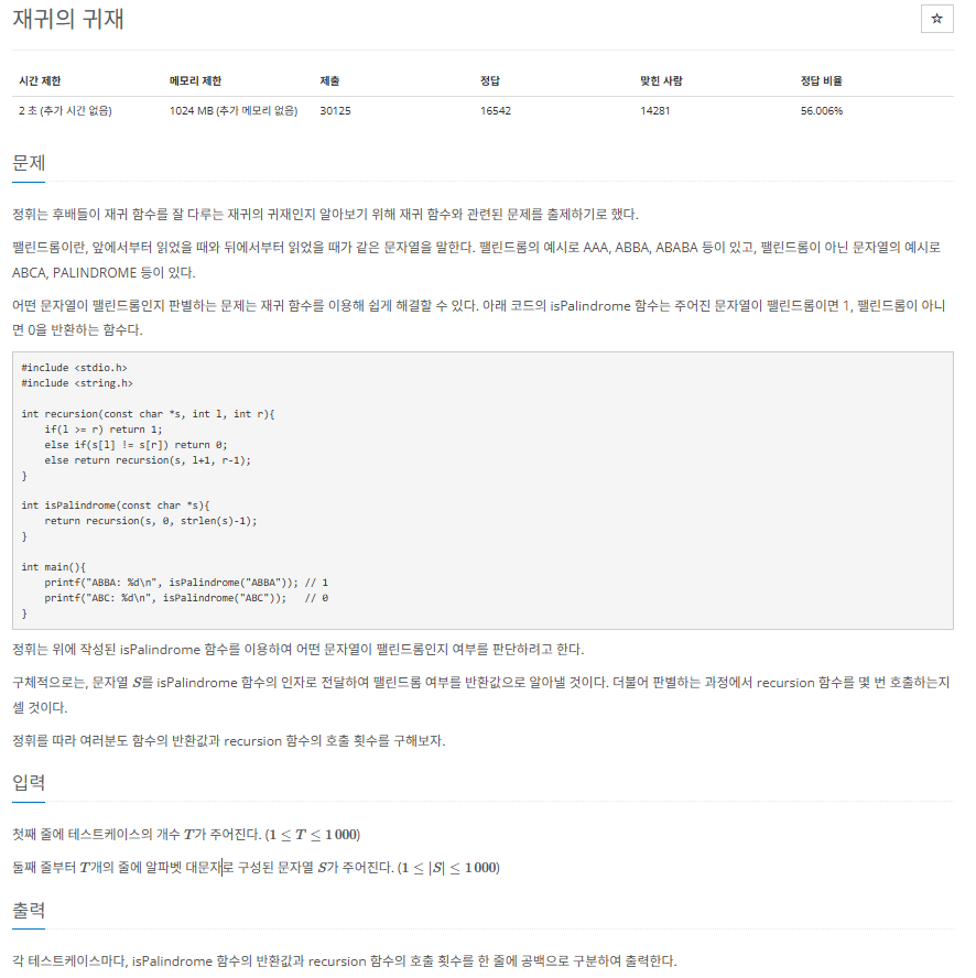 - isPalindrome 함수의 반환값과 recursion 함수의 호출 횟수를 한 줄에 공백으로 구분하여 출력