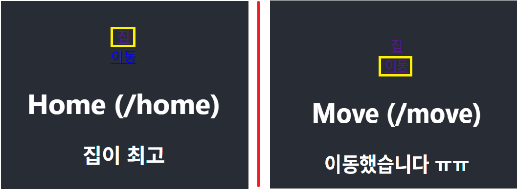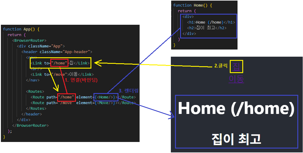 - <Link to="/home">집</Link>를 클릭할 경우 to="/home"과 동일한 링크인 path="/home" <Route>를 찾음