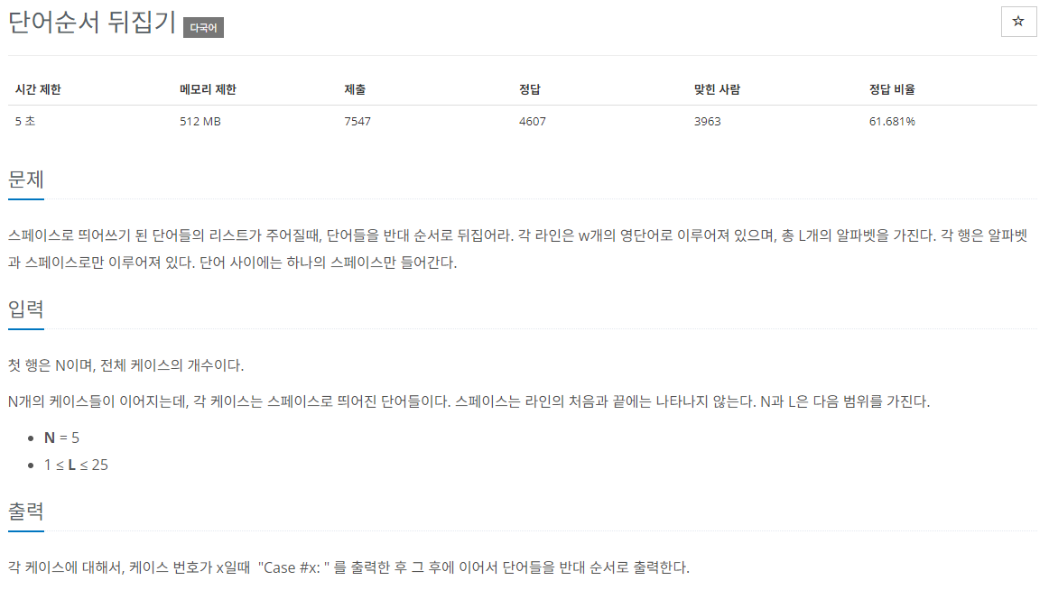 - 문자열을 입력 받아 공백 단위로 나눈 뒤 거꾸로 출력하는 문제