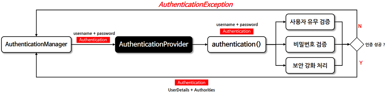 - 인증 과정 중 문제 발생 시 AuthenticationException과 같은 예외를 발생시켜 문제를 알리는 역할
