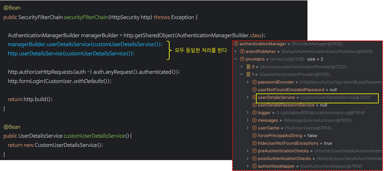 → 실질적으로 위의 사진처럼 http.userDetails(customUserDetailsServcie())와 같은 코드가 불 필요 - 하지만, 빈으로 등록하지 않고 일반 객체로 사용할 경우 http.userDetailsService(new customUserDetailsService()) 코드 필수