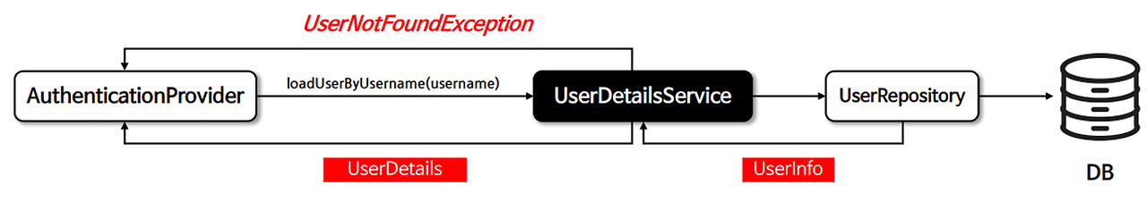 - Repository에서 DB에 접근하여 username에 맞는 사용자 정보를 가지고 와서 도메인 객체(엔티티 등)에 담음