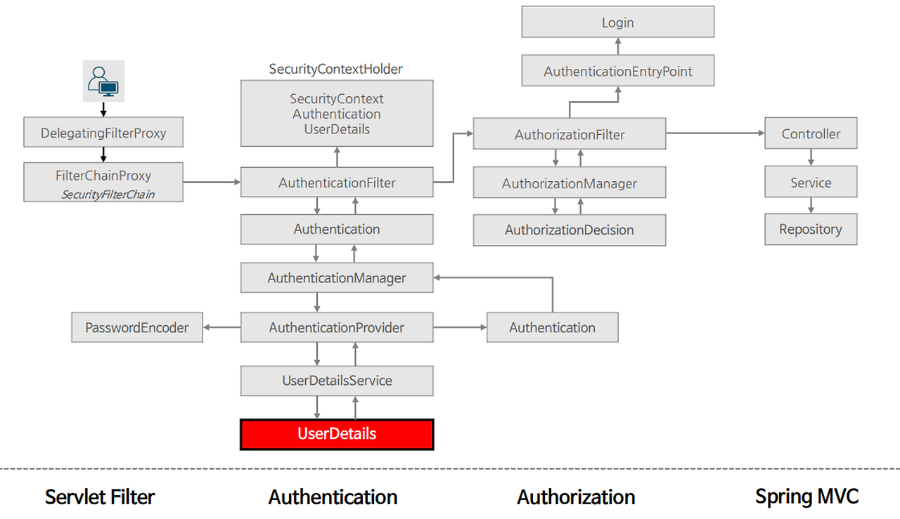 - Provider → UserDetailsServcie → UserRepository를 통해 사용자 정보를 가지고 옴