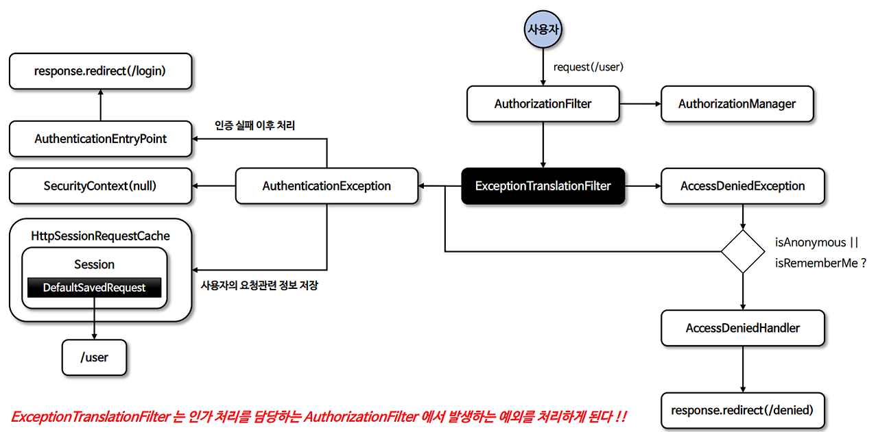- MVC에서 잡아내지 못한 예외는 ExceptionTranslationFilter까지 전달이 되어 ServletException을 처리할 수는 있으나, 원래는 AuthenticationException과 AccessDeniedException을 처리하기 위한 필터