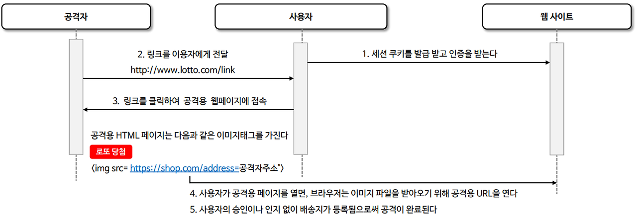 - 이는 사용자가 로그인한 상태에서 악의적인 웹사이트를 방문하거나 이메일 등을 통해 악의적인 링크를 클릭할 때 발생 가능